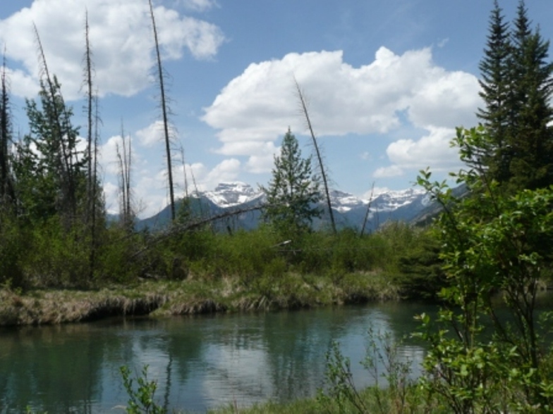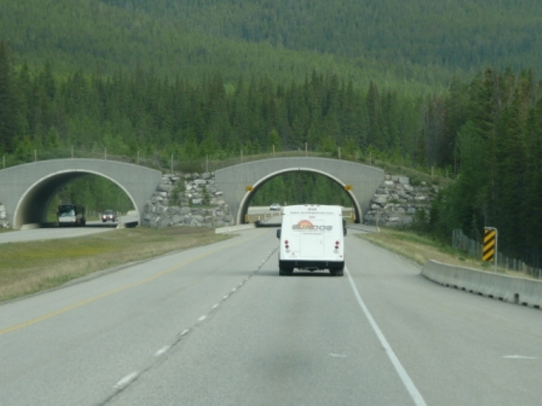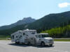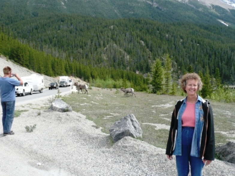 After driving north through Calgary enjoying the snowcapped Canadian Rockies, we stopped at a turnout at Lac des Arcs for a beautiful view, ate lunch at Dead Man’s Flats and arrived at Banff National Park where we camped for 2 nights. What a beautiful park! We visited Lake Louise and it was certainly as beautiful as everyone told us. It is very blue and we were able to see the Chateau and mountains reflected in it. We had warm apple strudel in the Lakeside Lounge with a stunning view of the mountains. We saw grizzly bear tracks at Fenland Trail along Echo River, bighorn sheep and elk at Lake Minnewanka. At Lake Minnewanka we saw several scuba divers taking advantage of the clear water to dive...the water temperature was about 40 degrees!....Burr!!! The park has made large mammal overpasses over Highway 1, with fences to guide the mammals across the overpass rather than across the busy 4-lane highway. They really look quite natural although we didn’t see animals crossing while there.