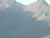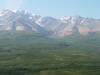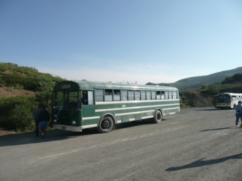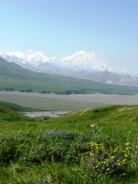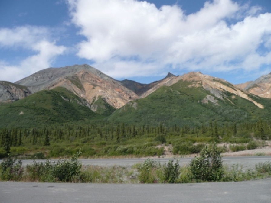 July 12 -- Denali National Park — Thanks to advice from Ed and Sandy we stopped at Rose’s Café in Healy on our way from Fairbanks for a delicious lunch. We’ve spent the past week about 4 miles north of Denali National Park at the Denali RV Park and Motel. We have a lovely view of the mountains out our windows and the staff is quite friendly and helpful regarding both the area and the National Park. We’ve had pretty weather with only one day rainy and cooler, so we’ve had GREAT sightings of Mt McKinley when we’ve been in the park. As Mt. McKinley is only fully visible or, according to the locals, “The mountain is out,” 20% of the time we feel quite fortunate to have seen it on 2 consecutive days. This is a link to a live Mt McKinley webcam so you can see if "the mountain is out". When we talked to Ranger Ken in the Denali Visitor Center to plan our trip, he suggested we take the shuttle to at least Eielson Visitor Center, marking on the park map areas we might want to look at more in depth on the way back, then get off and on the bus as we wanted on the return trip. We took the 6:30 AM shuttle bus from the Wilderness Access Center to the Eielson Visitor Center, a 66-mile, roughly 8-hour round trip. We rode through the drunken forest (so named for the leaning trees due to the permafrost), saw the braided Savage River, Dall Sheep far up on a hillside (thank goodness for binoculars and telephoto lens!), Polychrome Pass with beautifully colored mountains, and a recent earth slide where we could see a very large “V” in the side of a mountain. We enjoyed our picnic lunch at the Eielson Visitor Center with Mt. McKinley looming just over our shoulders, still 30 miles away. We hiked a bit, walked on the tundra and enjoyed the displays in the visitor center which was opened in June, 2008 and is built into the hillside with the roof as an observation deck so you mainly see and enjoy the scenery. We could not have picked a better day to visit because Mt. McKinley was fully visible when we arrived, but by the time we boarded our return shuttle bus an hour and a half later, clouds were closing in. On our return trip, we saw a grizzly about half a mile from the dirt bus road, and later two separate caribou.