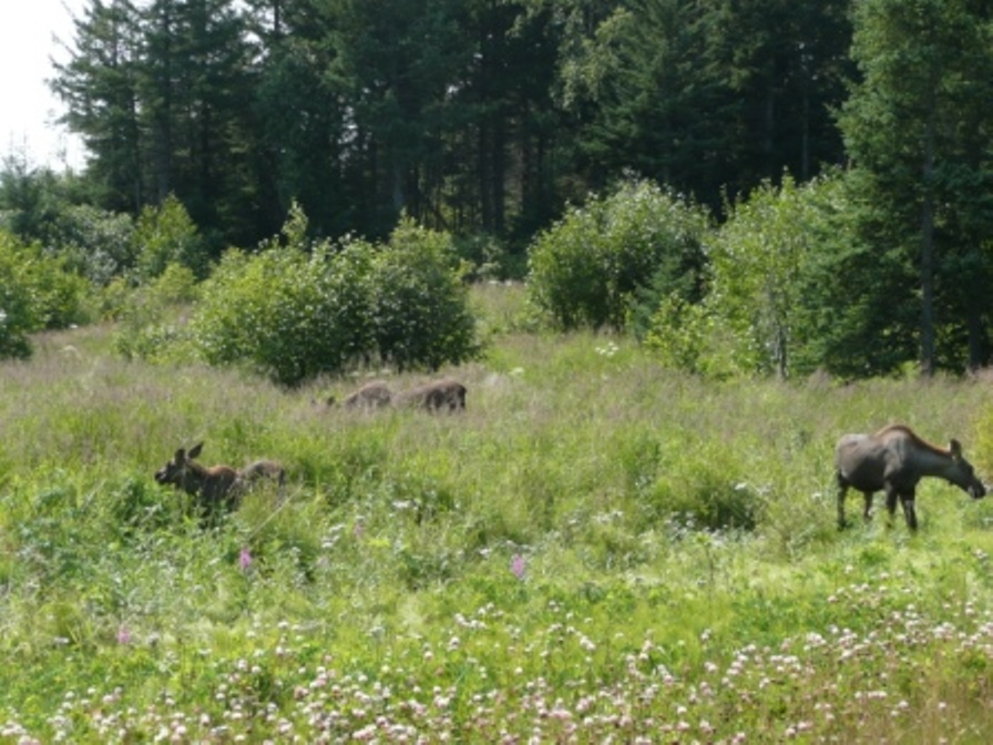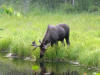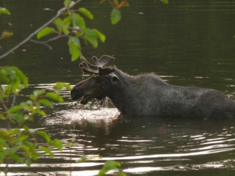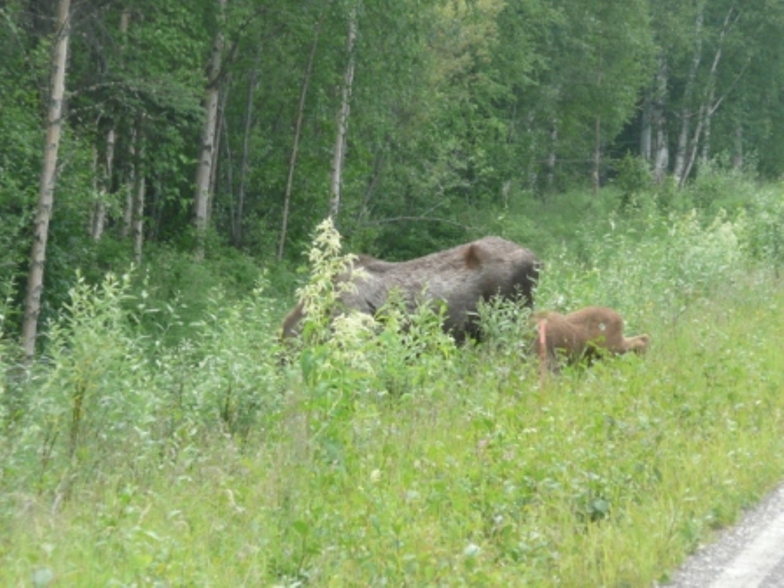 While in Fairbanks we also visited The Great Alaska Bowl Co, where we watched them make bowls and purchased a few more Christmas gifts; the Fairbanks Farmer’s Market which was more food and craft booths than produce but was quite interesting; visited the University of Alaska Fairbanks Museum of the North; walked the Boreal Forest trail at Creamer’s Field where we saw various trees and wildflowers and learned about the ecosystem. WE SAW MOOSE—lots of them; our trip is complete! We drove the Chena Hot Springs Road and first saw a moose cow with two calves right along the road. We spent July 4th weekend boon docking at the Chena River State Recreation and meet Sandy & Ed from North Pole, who were also spending the weekend there. They took us driving along the road Sunday evening and we saw at least 12 moose, including 2 bulls and 2 calves. We got some great pictures as you can see. Thanks to Sandy & Ed for being our own personal wildlife guides. As a special treat, we saw a porcupine crossing the road although we weren’t able to get pictures. We learned a lot about bear and moose habitats and hunting from Ed and more about the area from both. Monday we headed south to Denali National Park where we’ve decided to stay for a week. There is a fire somewhere because we saw and smelled smoke most of the way from Fairbanks to the Denali RV Park and Motel.
