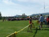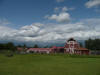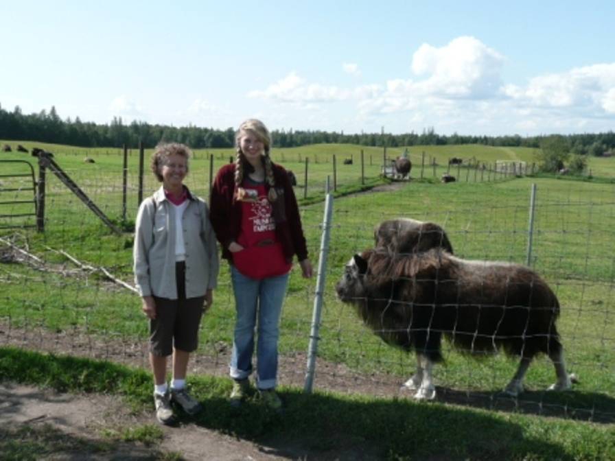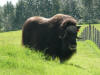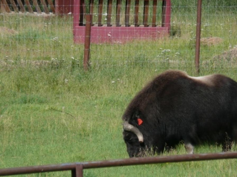 We spent a few days camped between Palmer and Wasilla. While in the area we looked for Sarah Palin in Wasilla, but didn’t find her although we visited Alaska’s largest Wal-Mart; we’d been to the world’s largest Target store located in Anchorage, so what more can we ask? We visited the Vern Halter Dream A Dream Premier Iditarod Kennel where we met Vern and enjoyed his informative presentation and video. Vern is a veteran Iditarod and Yukon Quest musher and his wife Susan, a veterinarian, is a Yukon Quest veteran. While there we took a hike with the 12-week old pups, Hickory, Dickory & Doc, and enjoyed a sled-dog ride. Vern and Susan have developed a great facility. Kathy apologizes in advance for the picture quality; she forgot the camera and took these with her phone. We spent an afternoon at the Matanuska Glacier, first at the State Recreation Area where we could see the glacier and hike a 1-mile nature trail with frequent information panels about glaciers and the surrounding natural environment, and then driving to and walking on the glacier itself. What an experience! We took a container to bring home some glacial ice, although it melted before we got back to the campground. It was a bit muddy but worth the trek. We kept seeing signs about a wedding, and as we were returning from the glacier, we encountered the nervous groom and the minister and wondered aloud how the bride would arrive and how she’d be dressed. As we got closer to the parking lot, we encountered the bride and her party; all in their wedding attire! The bride was lovely, and very brave to wear her beautiful gown across the mud to the glacier. We noticed she and her attendants had on boots and most of the groomsmen had cleats on their shoes. We learned that the couple became engaged at the glacier and decided to be married there as well. After our glacier visit, we had dinner at the Long Rifle Lodge where we had delicious food in a rustic atmosphere with a great view of the glacier and Chugach Mts. We decided to go “wildlife viewing” along Hatcher Pass Rd, a 49-mile loop road that is both paved and unpaved. We had beautiful views of the Little Susitna River, the Talkeetna Mountains and the Chugach Mountains. We saw a beaver, dam and lodge along the way, but when we turned onto the narrow, bumpy, dirt and gravel portion of the road, it became quite smoky so after about 600 feet we turned around as we weren’t going to be able to see anything and the road really was quite rough with no guard rails and a big drop off to the side. We visited the nearby Musk Ox Farm, the world’s only domesticated musk ox farm. Hannah, our tour guide told us about the Oomingmak Cooperative, domesticating the musk oxen and harvesting the Qiviut or under wool of the musk ox. We’d read that it was harvested by hand but didn’t realize they actually use a hair pick about the size a woman uses for her hair! We enjoyed getting a closer view of the musk oxen, which ranged from calves to yearlings to adults.