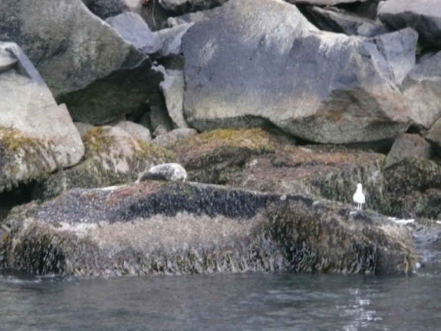 We stayed at Stoney Creek RV Park just north of Seward, a peaceful campground on the Stoney Creek. While in Seward, we visited the Alaska Sea Life Center, walked along Resurrection Bay on the Iditarod Trail, watched sea otters play in the bay, walked along the small boat harbor, saw the Benny Benson Memorial and had lunch at AK Nellie’s on 4th St. In 1926, as a 7th grader, Benny Benson entered a contest to design the Alaska flag which he won, earning a $1000 scholarship; quite a fortune at that time. We spent an afternoon at the Kenai Fjords NP Exit Glacier Nature Center, the only area of the national park reached by road, where we enjoyed a ranger-led walk along Exit Creek to Exit Glacier. He pointed out a tree with bear claw markings where a Black bear had apparently climbed the tree and another tree where a moose had rubbed the bark off with his antlers. Kenai Fjords National Park, a 607,805 acre park, is over half covered by The Harding Icefield. The park is primarily accessible by boat tours, so we took the Northwestern Fjords tour on a 70-foot catamaran, the Aialik Voyager. It was rainy, windy and about 60 degrees so the water was a little rough, but wow, what a tour! We saw sea otters, 6 humpback whales in 3 different sightings, stellar sea lions, Dall’s porpoise who were much too quick to get decent pictures, a harbor seal, horned & tufted puffins, cormorants, gulls, common murre, fork-tailed storm-petrel, a mountain goat and 2 pairs of eagles. We met our goals for the day and then some! Because of the rougher seas (and several seasick passengers, fortunately not us!) we visited Holgate Glacier rather than Northwestern Glacier, but it was still pretty amazing, a one-quarter mile, 200 ft thick glacier that calved while we were there. We had dinner one night at Chinook’s Restaurant on the harbor and the food was delicious. Kathy had grilled wild Alaskan salmon and landlubber Bob had a fillet in mushroom gravy. Both were delicious, the service was good and the atmosphere was fun.