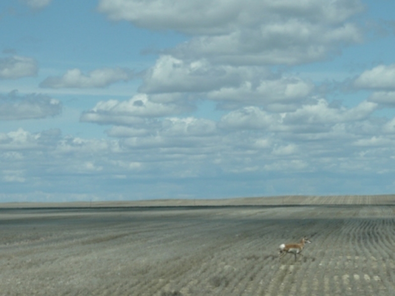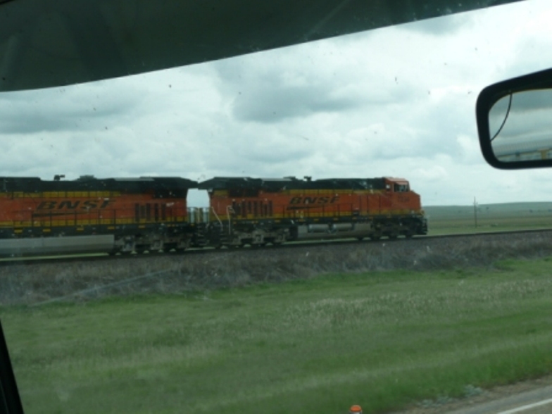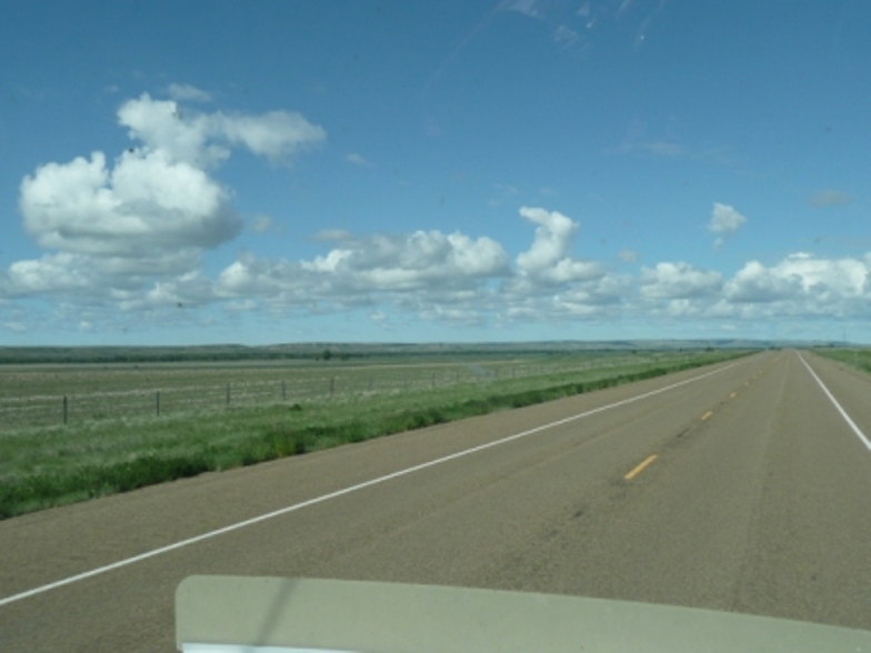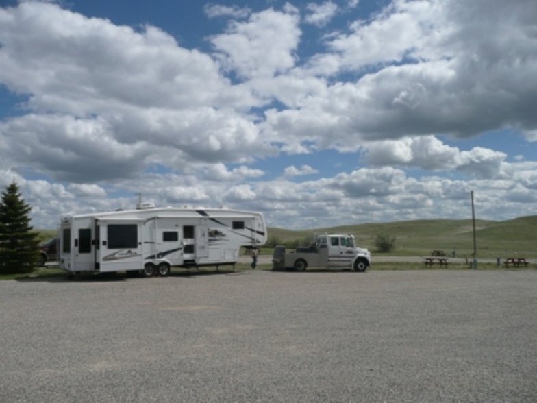 June 11, 2009 -- We left S& H Campground in Greenfield, IN at 10:00 am Sunday, where it was sunny and 75 degrees. We drove north through Illinois and stopped for the night at the Smokey Hollow Campground in Lodi, WI, a nice, family-oriented 5-star campground. However, we forgot to take a picture of the campsite! Monday it was 53 degrees and rainy as we drove through Wisconsin where we saw picturesque farms with large red barns and dark, fertile soil. In Minnesota we saw an elk farm and later a buffalo farm along the interstate. We stopped for the night at Simonson Truck Stop in Grand Forks, ND. Tuesday it was 47 degrees and cloudy as we headed west on US 2 through North Dakota where we crossed the geographical center of North America. As we crossed into Montana it is easy to see why it is called Big Sky Country because we saw such panoramic views of the sky with soft fluffy clouds. We spent Tuesday night at Rancho Campground in the Ft. Peck Indian Reservation. Wednesday it was sunny and 58 degrees with very few clouds. We saw four herds of mule deer grazing in fields along the highway through MT, lots of wheat fields and big grain elevators. Most of the trains we’ve seen are livestock or grain haulers but we did see an Amtrak passenger train as well. We saw several distance bicyclers heading east along the highway, a few snowcapped mountains in the distance and very rocky terrain. We arrived at Lewis & Clark Campground in Shelby, MT where we will spend 2 nights catching up on laundry and other necessities and reviewing our route further north. The campground owners are very helpful with Canada and Alaska information.