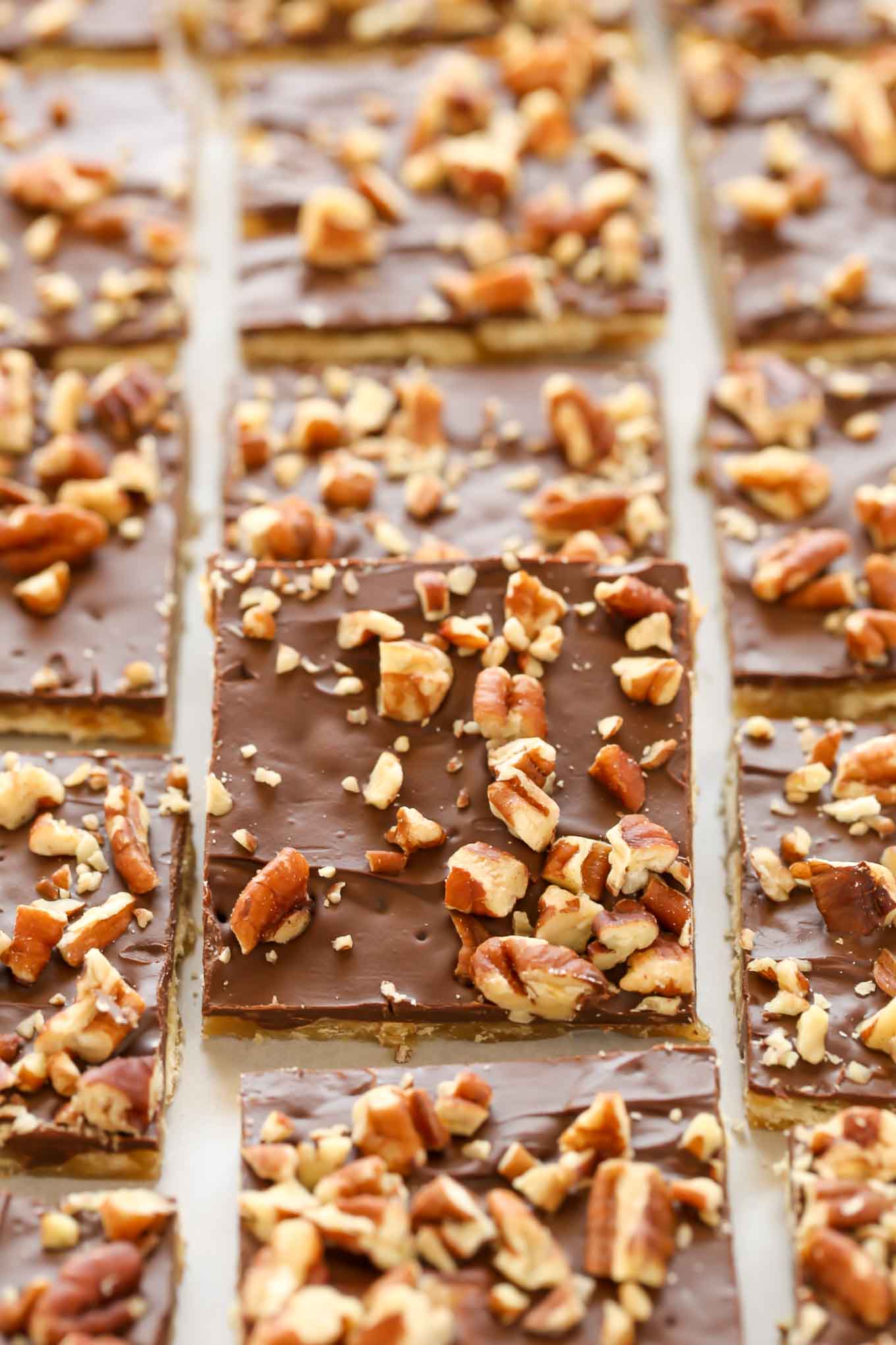 Mix butter and sugar and boil 3-4 minutes. Spread saltines on cookie sheet. Pour boiled mixture over saltines and bake at 350 degrees for 15 minutes. Pour chocolate bits over and bake 35 seconds. Sprinkle with nuts and cool about 2 hours.