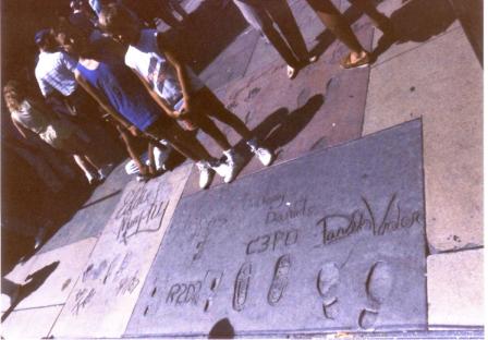 Drove to Hollywood. Walked on Hollywood Blvd & saw pink & charcoal terrazzo stars on sidewalk. Saw Graumann’s Chinese Theatre with names & prints in concrete.