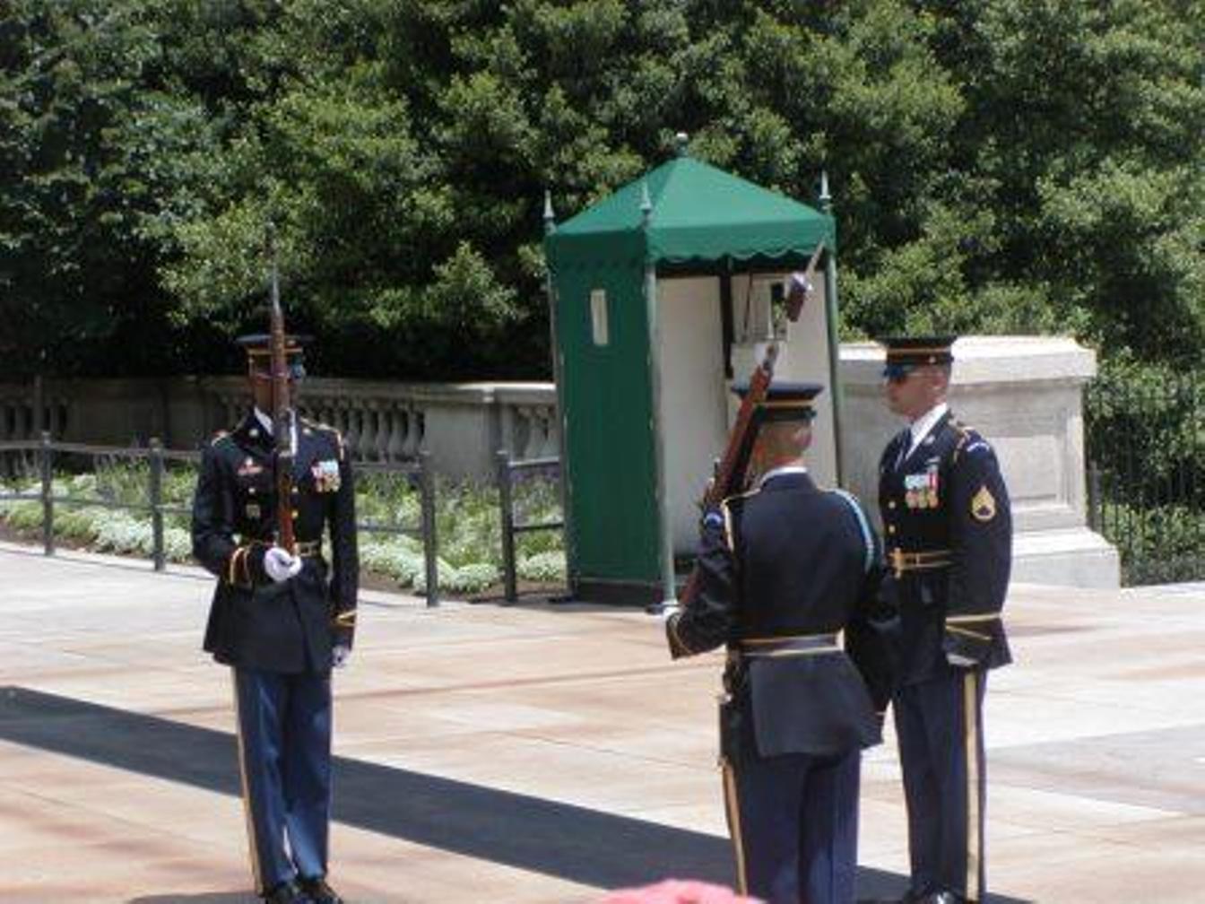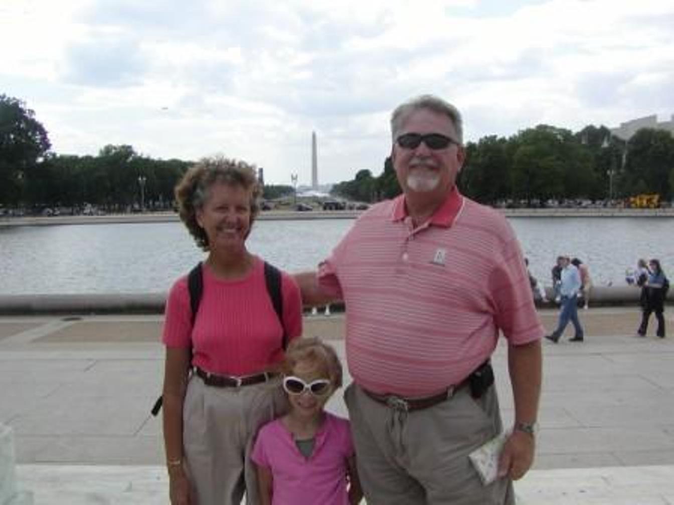 Wednesday June 6 Up early and to Union station via bus & rail; we are getting pretty good at our transfers! We bought Tourmobile tickets and obtained a Metro police patch for Mike. The tourmobile goes all around the city, including Arlington National Cemetery. We visited the Jefferson Monument, saw John & Robert Kennedy's graves in Arlington, saw the presentation of the wreath at the Tomb of the Unknown Soldier and changing of the guard--what an awesome experience. We had lunch at a street vendor near the Lincoln Memorial, then stood on the step of the Memorial where Martin Luther King gave his "I Have a Dream" speech. We stopped at the White House Visitor Center as you have to request White House tour tickets at least 6 months in advance (which we didn't realize in time) and took pictures of the White House. We toured the National Archives to see the Declaration of Independence, Constitution and the Bill of Rights. We also saw one of the three existing copies of Magna Carta. We then walked to Grandpa's cousins, Suzan & Chris, to visit and had a delicious dinner with them at Chef Geoff's in DC. Suzan drove us back to the campground at 9:30 PM. A long but fun-filled day.