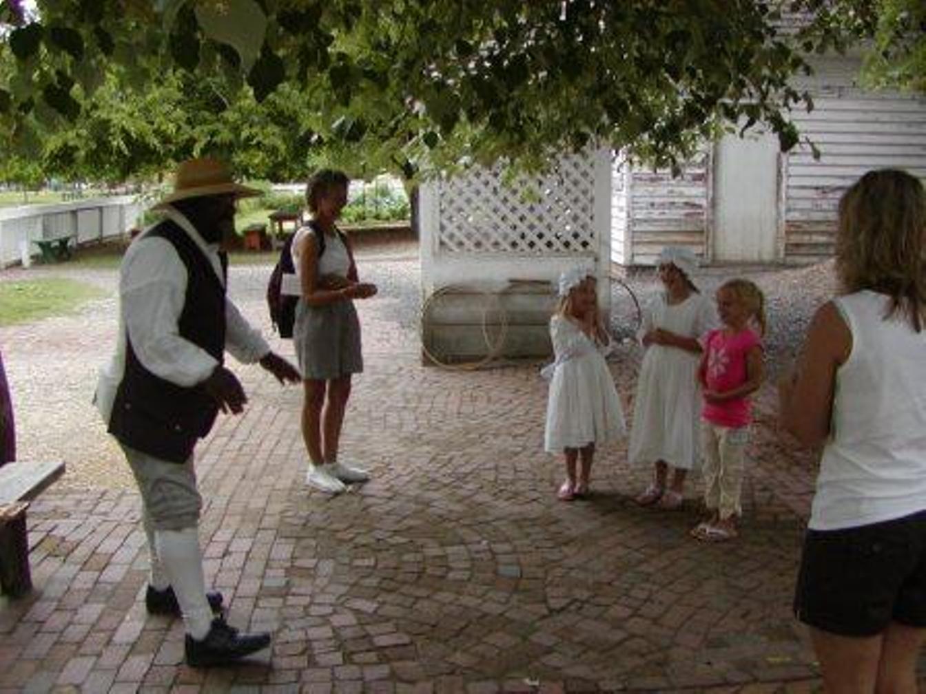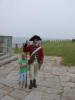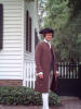 Monday June 11 Toured the remainder of Williamsburg this morning. It is interesting that there are private homes among the historic buildings. We drove the Colonial Highway to Yorktown and had lunch at River Landing on the York River. It was a very pretty view. We toured Yorktown Settlement and saw a cannon demonstration. Shelby participated as an army member in a demonstration. Shelby treated us to a conversation with "Kristen", a southern belle who was quite entertaining on the drive back to the campground! (see picture below) We swam in the campground pool again in the evening.